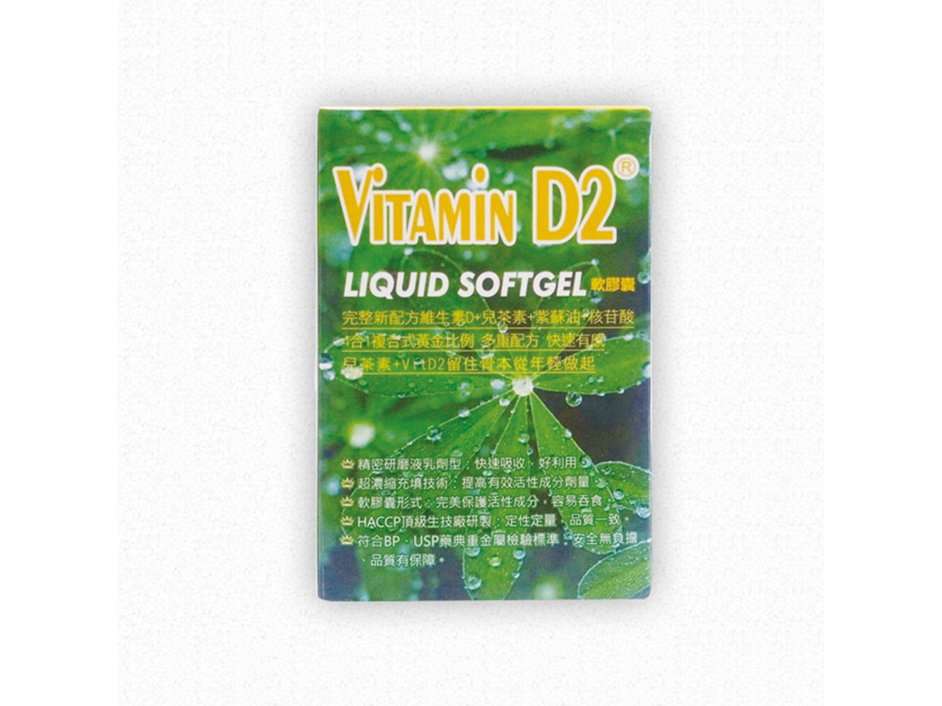 成分: D2(800iu), 兒茶素30mg, 紫蘇油300mg, 核甘酸20mg, 植物膠